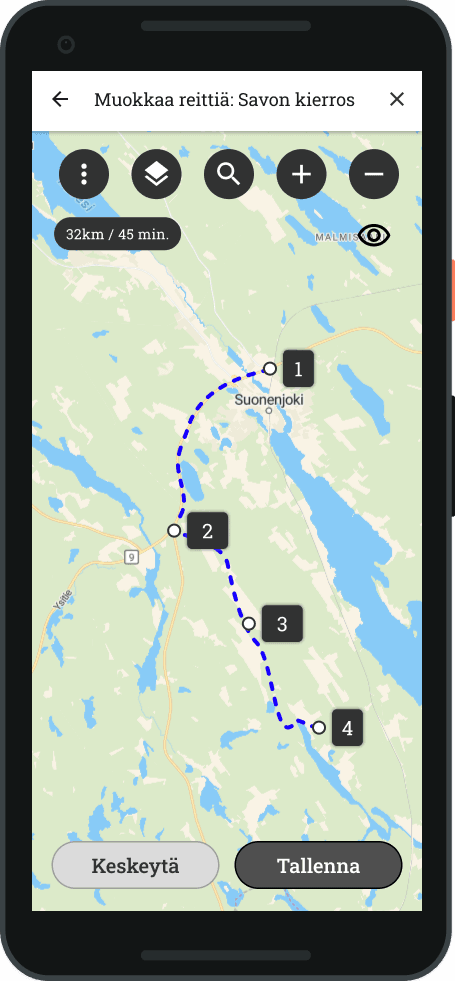 Viimeistelemme Android-sovelluksen reitinmuokkaustoimintoa. Pian voit tehdä ja muokata reittejä suoraan sovelluksessa – helposti ja joustavasti, juuri omien tarpeidesi mukaan. Tutkimme edelleen myös mahdollisuutta saada sovellukseen Android Auto tuki.
